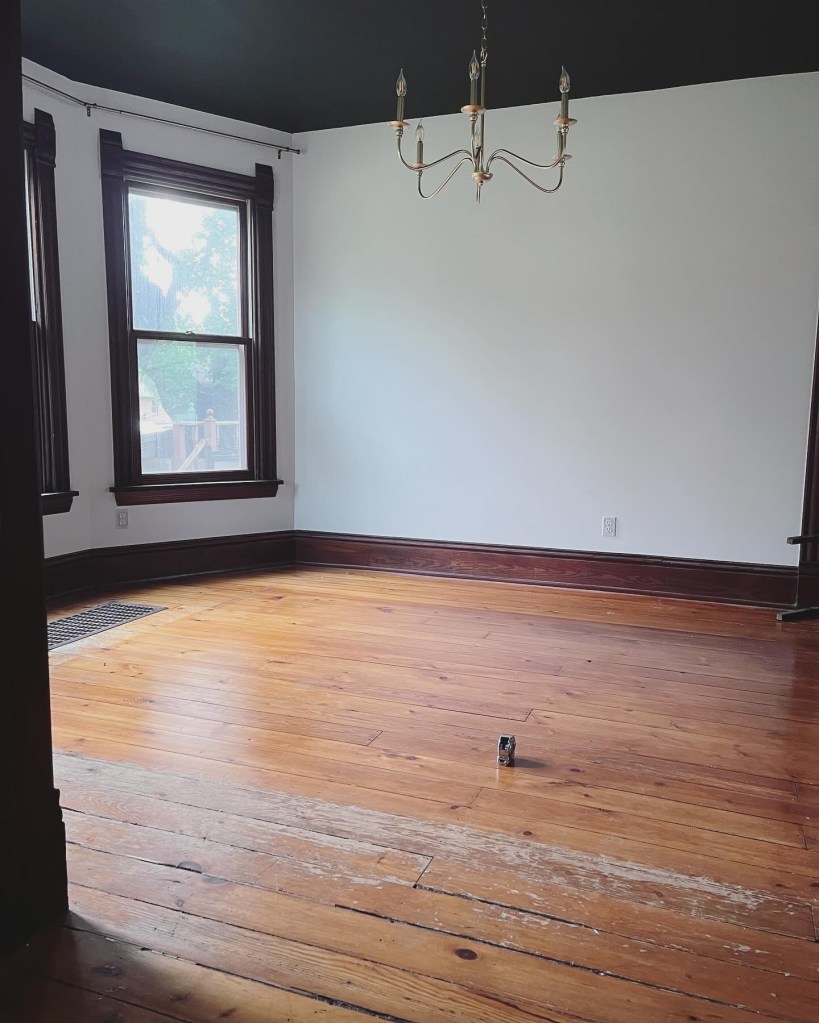 One of the things I loved about Apricity house was the original wood flooring. Unfortunately, the previous owners did not take great care of them. In places the finish was completely warn off, there were some boards that with holes in them, and age had turned the finish too orange for my liking. We knew we needed to refinish the floors and this summer we took the first step and refinished the downstairs.